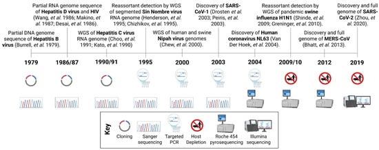 Milestones in virus genome sequencing technologies. The timeline illustrates the chronological progression of sequencing technologies and their impact on the discovery and characterisation of human viruses from 1979 to 2019. The evolution also emphasises how technological advances have transformed viral discovery and molecular epidemiology, enhancing surveillance capabilities to enable more rapid responses to (re)emerging threats [,,,,,,,,,,,,,,,]. Abbreviations: WGS, whole genome sequencing. Created in Biorender (biorender.com).