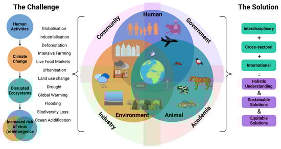 The emergence of infectious diseases is driven by a complex interplay of human activities and environmental changes that intensify contact between species. Climate change driven by human activities, including deforestation, intensive farming, and encroachment on natural habitats, can cause biodiversity loss, disrupt ecosystems, and facilitate spillover events. Demographic trends such as urbanisation, population growth, and ageing populations, along with globalisation via travel and trade, accelerate virus dissemination. Following a spillover event, viruses can rapidly disseminate in immunologically naïve populations, with far reaching implications for conservation, agriculture, food security, and human health [,,].