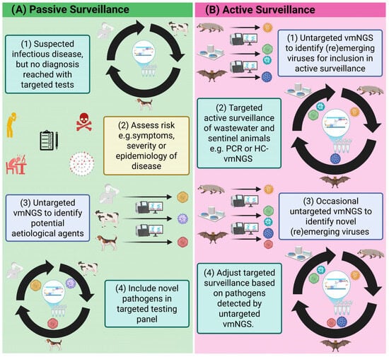 The millions of fatalities and cases of morbidity resulting from the COVID-19, 2009/2010 swine flu, and AIDS pandemics, along with recurrent outbreaks of flaviviruses, filoviruses, poxviruses, and others, illustrates the ongoing threat posed by (re)emerging viruses to human health []. The next pandemic may arise from an entirely unknown source, so-called Disease X in humans or Disease Y in animals, or rapidly evolving pathogens. Multiple recent outbreaks of novel aetiology have been caused by the zoonotic spillover of viruses from animals to humans, which is driven by changes in animal, environmental, and human health, aligning the Disease X/Y issue with the One Health paradigm introduced in Section 1.2. Timely detection and strategic surveillance of Disease X/Y causing viruses are critical components of pandemic preparedness, but the suitability of current PCR diagnostics is limited by the lack of genetic references. In these scenarios, untargeted approaches that do not require prior sequence knowledge such as metagenomic next-generation sequencing (mNGS) have become increasingly valuable for both virus discovery and genomic surveillance. This review examines the current literature using mNGS for virus discovery and surveillance to propose a practical framework for integrating mNGS into (re)emerging virus surveillance strategies.