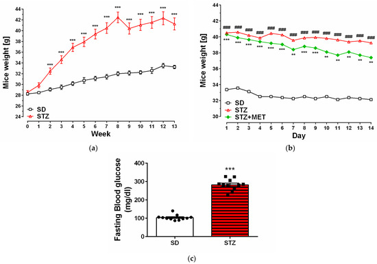 Animal weight [g] during experiment (a); MET administration (b); and blood glucose levels of control (SD) and diabtetic (STZ) mice [mg/dL] (c). ** p < 0.01; ***, ### p < 0.001 compared to the SD animals (8–16 for each group); ANOVA with Tukey’s post hoc test.