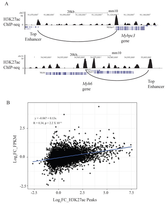 To provide further evidence that these ABC-linked enhancers regulate their putative target genes, we studied the correlation between changes in gene expression versus changes in peak height of the ABC-linked enhancers during pressure-overload-induced CM hypertrophy. For this analysis, we reanalyzed our previous work which detailed transcriptomic and epigenetic changes in a mouse model of heart failure through transverse aortic constriction [25]. Using RNA-seq and H3K27ac ChIP-seq datasets from that study, we found that changes in gene expression correlated modestly with changes in H3K27ac peak signals (Pearson correlation 0.34, p < 2.2 × 10−16) (Figure 1B). The correlation was stronger when focusing only on genes and enhancers with greater or less than a log2 0.5-fold change after transverse aortic constriction (Supplementary Figure S1A) (Pearson correlation = 0.51, p < 2.2 × 10−16). This result shows that globally, upon external stimuli, gene expression is regulated in the same direction as its ABC-linked enhancers.