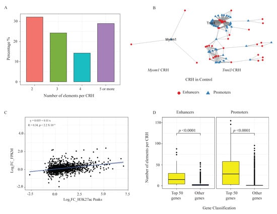 We integrated the ABC results to generate the CRHs, focusing first on the control samples. We identified 1522 hubs in these control cardiomyocytes with about 70% of the hubs containing fewer than 5 elements (Figure 2A). Figure 2B shows 2 examples of such hubs containing CM genes: Myom1 is a gene involved in the formation of myofibrils [30] and is found in a simple hub. In contrast, Tnni3, a CM-specific sarcomeric gene, is found in a more complex hub. Consistent with the correlation between gene expression and ABC-linked enhancers in heart disease, we observed that genes and enhancers within the same hubs were positively correlated in the same direction of change during CM stress (Pearson correlation of 0.32 (p < 2.2 × 10−16)) (Figure 2C). This suggests a co-regulation of genes and enhancers found within the same hub upon external stimuli. We then ranked CM genes by FPKM and selected the top 50 genes, which were mostly CM-specific genes, to glean biological insights about the characteristics of CRHs that harbor these genes. Our data revealed that highly expressed CM genes were more likely to be in hubs with more regulatory elements than non-highly expressed genes (Figure 2D). Such multi-enhancer hubs have been proposed as a mechanism to buffer against external stresses and genetic perturbations and provide phenotypic robustness to disease-relevant genes [23,31].