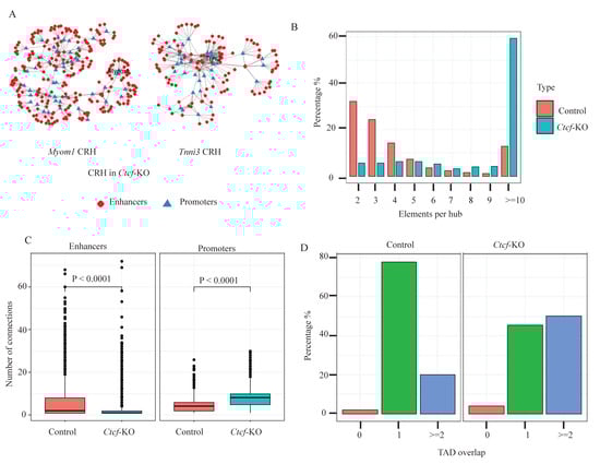 Next, we analyzed the CRHs in the Ctcf-KO CMs and found a marked reduction in the total number of CRHs, from 1522 in the control to 660 CRHs in the KO, accompanied by an increase in the number of elements per hub. Figure 3A shows an example of the same hubs containing two CM genes, shown in Figure 2A, showing an increase in the number of elements within each hub. Figure 3B shows the distribution of elements per hub, confirming a striking increase in the percentage of hubs with 10 or more elements. Associated with this increase in the percentage of complex hubs, there was an increase in the average number of connections per gene in the Ctcf-KO cells and a decrease in the number of connections per enhancer (Figure 3C, Supplementary Figure S1B). The decrease in the number of connections per enhancer was due to the overall increase in the number of enhancers that crossed the ABC threshold while maintaining the same number of expressed genes. Next, we asked if this reduction in the total number of CRHs in the Ctcf-KO was merely due to the merging of CRHs or the formation of new CRHs and observed both cases. The merging of CRHs was observed primarily in the simple hubs (2–3 elements per hub) located next to each other as 403 (82%) of the 492 simple hubs merged with 1 or more other hubs to form larger hubs. For the larger hubs, there was redistribution and formation of new hubs as genes gained new interactions and lost other interactions. To further confirm the importance of CTCF in the organization of these hubs, we compared CTCF binding sites in the control hubs vs. Ctcf-KO hubs. Our analysis showed an enrichment of CTCF in the control hubs (Fisher’s exact test odds ratio of 1.69, two-sided p < 2 × 10−16). Next, we analyzed the relationship between CRHs and TADs, since TAD boundaries are enriched for CTCF [25], and earlier studies have shown that CRHs are generally constrained within TAD boundaries [14]. Indeed, using the TADs in the control as a reference, our data showed that about 80% of CRHs in the control were contained within the same TAD, while only 20% spanned more than one TAD. In contrast, about 45% of CRHs in KO were contained within a TAD, while 50% of CRHs in the KO spanned more than one TAD (Figure 3D); furthermore, 5% were not within TAD boundaries, showing that the loss of CTCF leads to a reorganization of the CRHs with the formation of cross-TAD enhancer–promoter interactions.