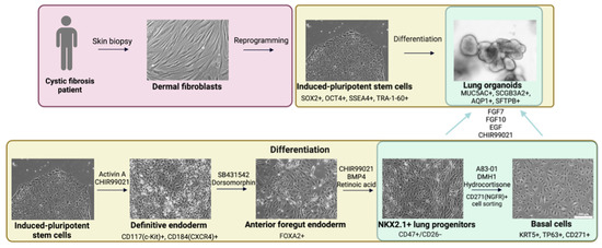 Cellular models (immortalized cell lines, primary human bronchial epithelial cells and intestinal organoids) that model CF are used for in vitro evaluation of the efficacy of compounds for the pathogenetic treatment of CF [5,6,7]. Since the respiratory system accounts for the majority of lesions in CF [8], lung cell cultures may be an ideal model for the study of CF, as well as for developing and evaluating the effectiveness of therapies. Among lung cellular models, 3D cell cultures (organoids) best model the structural, phenotypic and functional characteristics of the native organ. The generation of primary cells for the formation of lung organoids is accompanied by highly invasive procedures. Consequently, a promising direction is to obtain human induced pluripotent stem cells (hiPSCs), which are generated by reprogramming skin cells, blood cells, urine and hair follicles [9,10], with subsequent differentiation in the epithelial direction. Biological materials for the production of hiPSCs are confirmed to be affected by CF, so they may be obtained to generate hiPSC-derived LOs from CF patients.
