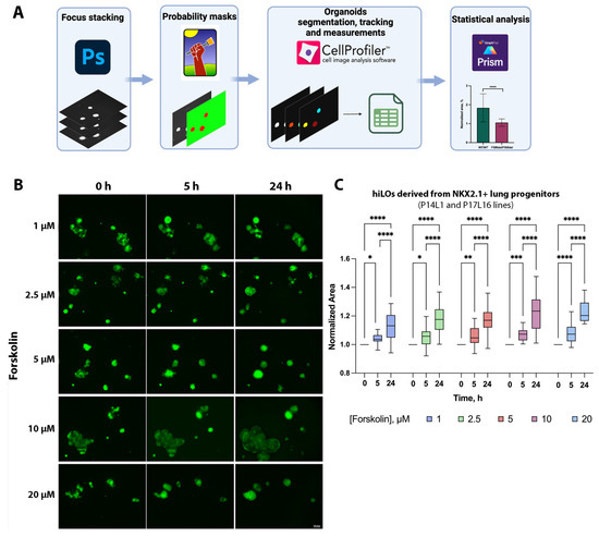 Forskolin-induced swelling of hiLOs from NKX2.1+ lung progenitors from a healthy donor. (A) A schematic representation of the image analysis of the FIS assay. The analysis comprises the following steps: z-stacking of organoids in different planes in Photoshop (Ps), then compilation of probabilistic masks to determine the area of the organoid in ilastik software, then measurement of the organoid area and the relation of objects over time in CellProfiler software and finally statistical analyses using GraphPad Prism. (B) Fluorescence microscopic images of hiLOs (P17L16 cell line) at three time points (0, 5 and 24 h) under the influence of different concentrations of forskolin. Scale bar, 100 μm. (C) Quantification of the normalized swelling area of the hiLOs (P14L1 and P17L16 cell lines) at 0, 5 and 24 h, calculated from the area at 0 h. The data are presented as the median, Q1-Q3, with n = 9 technical replicates, and the mean number of organoids analyzed in each group was 63 individual organoids. * p < 0.05, ** p < 0.01, *** p < 0.001, **** p < 0.0001.