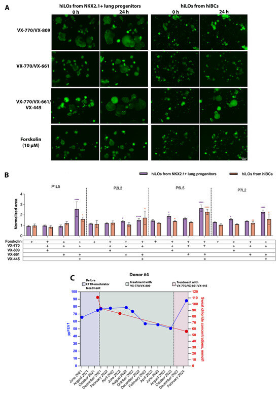 Forskolin-induced swelling of hiLOs obtained from NKX2.1+ lung progenitors and hiBCs with a homozygous F508del mutation in CFTR in response to CFTR modulators (mixture 1:1 of the potentiator VX-770 with the correctors VX-809, VX-661 and VX-661/VX-445). (A) Fluorescence microscopic images of hiLOs (P5L5 cell line) at two time points (0 and 24 h) under the influence of modulators. Scale bar, 100 μm. (B) Quantification of the normalized (based on time point 0) swelling area of hiLOs derived from NKX2.1+ lung progenitors and hiBCs at time points = 0 and 24 h. Data are presented as the mean ± 95% CI, n = 9 technical repeats, and the mean number of organoids analyzed in each group was 51 individual organoids. * p < 0.05, ** p < 0.01, **** p < 0.0001. (C) Two therapeutic endpoints (ppFEV1 (percent predicted forced expiratory volume in the first second) and sweat chloride concentration before and during CFTR modulator administration) of donor #4 with a homozygous F508del mutation in the CFTR before and during CFTR modulator administration.