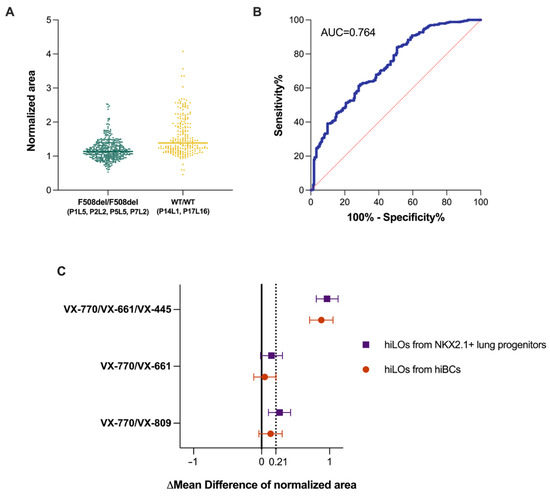 Predictive capacity analysis of hiLOs derived from NKX2.1+ lung progenitors and hiBCs from patients with a homozygous F508del mutation in the CFTR gene (P1L5, P2L2 and P7L2) and from healthy donors (P14L1 and P17L16). (A) Normalized area of the hiLOs after 24 h of incubation with forskolin. The mean numbers of organoids analyzed in each group were 226 for the F508del/F508del group and 125 for the WT/WT group. (B) ROC curve of the change in hiLO area in response to forskolin. The red dotted line represents an AUC (area under the curve) of 0.5. (C) The mean difference in the normalized area of hiLOs with CFTR modulators (mixture 1:1 of the potentiator VX-770 with the correctors VX-809, VX-661 and VX-661/VX-445) relative to the control group (without modulators) is represented by the mean difference ± 95% CI, GLMM. The zero line represents the statistical significance of the difference. The dotted value represents the threshold evaluated by ROC analysis.