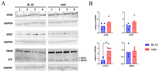 Protein levels in extensor digitorum longus muscle of 26-week-old mice. Total protein samples were prepared from four individual healthy control (BL 10 1–4) and four individual mdx (1–4) mice. A 20 µL sample (30 µg protein) was loaded in each lane. (A) Protein bands for autophagy-related 5 (ATG5), autophagy-related 7 (ATG7), microtubule-associated protein 1A/1B-light chain 3 (LC3), parkin (PRKN) and glyceraldehyde-3-phosphate dehydrogenase (GAPDH) as a loading control are shown. (B) Protein levels are reported as relative values to GAPDH. A significant difference can be observed in the ratio of phosphatidylethanolamine-conjugated LC3 (LC3 II) over unconjugated LC3 (LC3 I); p = 0.03 (*) between the BL 10 and mdx group, tested with an unpaired t test. Other protein levels are not significantly different. Graphs and statistical analyses were generated with GraphPad Prism 10.2.3. Full blots are provided as a supplement (Figure S1).