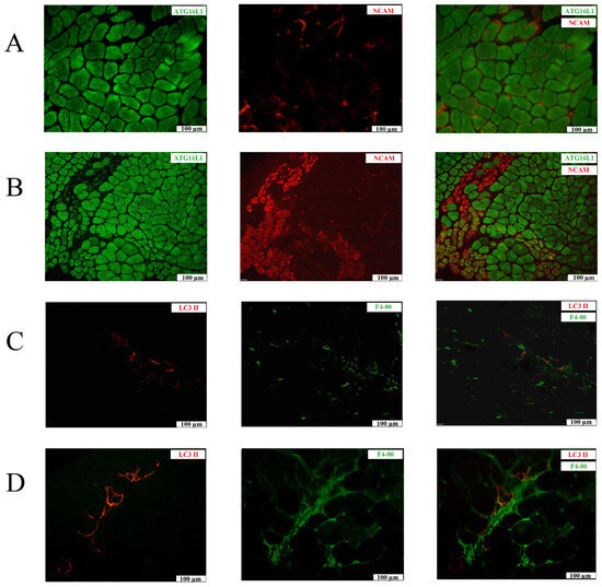Immunofluorescence staining of mdx soleus muscle of 4-week-old mice (A) and tibialis anterior muscle of 12-week-old mice (C,D). (A) Staining for autophagy-related 16-like 1 (ATG16L1; AlexaFluor 488, green) and neural cell adhesion molecule (NCAM; CY3, red) in a BL 10 control (A) and an mdx mouse (B) shows strong sarcoplasmic staining in the majority of muscle fibers. Strong NCAM staining is present in a cluster of small perifascicular muscle fibers in the mdx section, indicating that these are regenerating muscle fibers, and from these muscle fibers, ATG16L1 staining is absent. Staining for microtubule-associated protein 1A/1B-light chain 3 conjugated to phosphatidylethanolamine (LC3 II; CY3, red) and macrophages (F4-80; AlexaFluor 488, green) are shown in a BL 10 control (C) and an mdx mouse (D). (C) In a healthy control, LC3 II staining is mostly absent, and a few scattered macrophages can be observed. (D) In an mdx section, sarcolemmal LC3 II staining localizes to muscle fibers in perifascicular regions. Macrophages are abundant in this microscopic field, indicated by bright green fluorescence. The diffuse and weaker staining that can be observed in the connective tissue accumulating in the perifascicular region can be considered nonspecific. Scale bars = 100 µM.