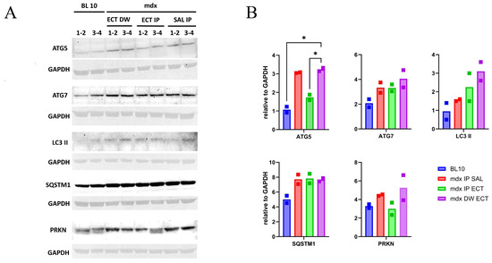 Protein levels in extensor digitorum longus muscle of untreated and ectoine-treated mice. Two total protein samples were prepared per group by pooling muscles from two individual mice. A 20 µL sample (30 µg protein) was loaded in each lane. (A) Protein bands for autophagy-related 5 (ATG5), autophagy-related 7 (ATG7), microtubule-associated protein 1A/1B-light chain 3 conjugated to phosphatidylethanolamine (LC3 II), sequestosome 1 (SQSTM1), parkin (PRKN) and glyceraldehyde-3-phosphate dehydrogenase (GAPDH) as a loading control are shown in control black 10 mice (BL 10 1–4), and mdx treated with ectoine in their drinking water (ECT DW 1–4), ectoine administered via intraperitoneal injection (ECT IP 1–4), and intraperitoneal saline (SAL IP 1–4), serving as a treatment control. (B) Protein levels are reported as values relative to glyceraldehyde-3-phosphate dehydrogenase (GAPDH). Significant changes can be observed for ATG5 levels, with an adjusted p = 0.02 between BL 10 and mdx DW ECT (*), and p = 0.04 between mdx IP ECT and mdx DW ECT (*), tested with the Brown–Forsythe test and Welch ANOVA for multiple comparisons. Graphs and statistical analyses were generated with GraphPad Prism 10.2.3. Full blots are provided as a supplement (Figure S1).