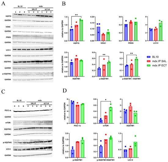 The levels of HSP70, voltage-dependent anion channels (VDACs), PRKN, LC3 II, SQSTM1, Ser366-phosphorylated SQSTM1 (p-SQSTM1), peroxisome proliferator-activated receptor-gamma coactivator 1α (PGC-1α) and mammalian target of rapamycin (mTOR) were evaluated in GAS muscle from BL 10 and mdx treated with saline or ectoine through intraperitoneal injection (Figure 4). In a first set of three mice per group (Figure 4A,B), the levels of HSP70 chaperones were significantly elevated in mdx IP ECT in comparison to BL 10. Furthermore, p-SQSTM1 levels were significantly elevated between these groups, and this increase remained significant when calculated as a ratio of phosphorylated to total SQSTM1 protein levels. The levels of VDAC were not significantly diminished in the mdx group, indicating that mitochondrial content was preserved, and levels remained unaltered in the treated mice. A significant induction of p-SQSTM1 could not be confirmed in a second set of three mice per group (Figure 4C,D); however, in this set, the levels of p-SQSTM1 and LC3 II also tended to increase with ectoine treatment.