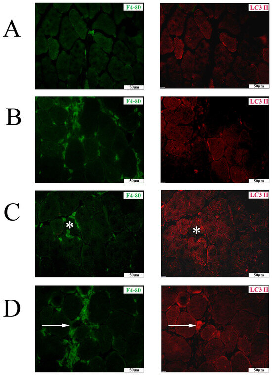 Immunofluorescence co-staining with F4/80 antibody, which stains macrophages (AlexaFluor 488, green), and 1A/1B-light chain 3 conjugated to phosphatidylethanolamine (LC3 II, CY3, red) in tibialis anterior muscle. In a healthy control (A) and mdx treated with intraperitoneal saline (B), infrequent partial sarcolemmal LC3 II staining is observed on certain muscle fibers. (C) In an mdx treated with intraperitoneal ectoine, macrophage staining localizes a necrotic invaded muscle fiber, which is LC3 II-negative (asterisk). (D) In an mdx treated with ectoine in its drinking water, macrophages are abundant, and a small muscle fiber surrounded by an inflammatory infiltrate is strongly LC 3 II-positive (arrow). Scale bars = 50 µm.