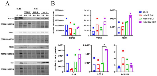 To assess mitophagy in ectoine-treated mdx, mitochondrial protein fractions were prepared from soleus (SOL) muscle and the levels of HSP70, VDAC, PRKN and LC3 were quantified (Figure 7). For normalization purposes, total protein levels determined through stain-free blot technology were used after the methodology was tested for robustness in comparison to housekeeping protein levels. Adjusted volumes for GAPDH were compared using an unpaired two-sample t-test and were found to be unaltered in mdx compared to BL 10 (Supplementary Figure S3). Significantly elevated LC3 II levels were observed between mdx IP ECT and mdx DW ECT, yet the difference was no longer significant when calculated as a ratio of LC3 II over LC3 I. Attempts to quantify SQSTM1 in mitochondrial extracts were unsuccessful, precluding a comparison between the treatment groups.