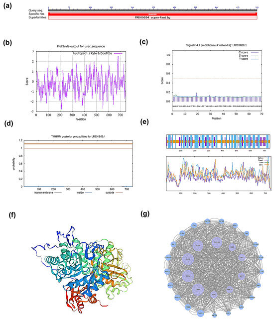Cloning and sequence analysis of PmHDS. (a) Analysis of conserved domains in HDS. (b) Hydrophilicity profile of the HDS protein. (c) Prediction of the signal peptide for HDS. (d) Prediction of transmembrane domains in HDS. (e) Prediction of secondary structure for the HDS protein. (f) Three-dimensional structure prediction of the protein. (g) Interaction analysis of HDS proteins.