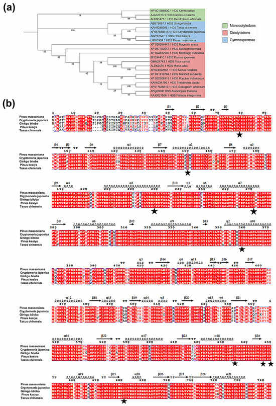 Evolutionary analysis of PmHDS protein. (a) Molecular phylogenetic tree of PmHDS. (b) Comparative analysis of amino acids in PmHDS from P. massoniana and its homologous genes across different species. Note: (a) Monocotyledons are represented in light green, Gymnospermae in light blue, and Dicotyledons in red. (b) The black pentagonal star indicates the cysteine active site of the HDS enzyme.