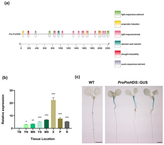 Analysis of tissue-specific expression patterns. (a) Analysis of the cis-regulatory elements of the PmHDS promoter. (b) PmHDS expression level in different tissues of P. massoniana. (TB: terminal bud; YN: young needle; MN: mature needle; YS: young stem; MS: mature stem; X: xylem; P: phloem; R: root). (c) Analysis of pBI121-proPmHDS::GUS staining, scale bar = 0.2 mm. The data represent the mean ± SE of three biological replicates. Different numbers of asterisks indicate statistically significant differences (* p < 0.05, ** p < 0.01, *** p < 0.001).