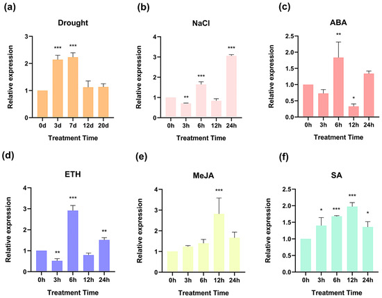 Expression levels under different treatments. (a) Expression levels under drought stress. (b) Expression levels under NaCl treatment. (c) Expression levels under ABA treatment. (d) Expression levels under ETH treatment. (e) Expression levels under MeJA treatment. (f) Expression levels under SA treatment. (* p < 0.05, ** p < 0.01, *** p < 0.001).