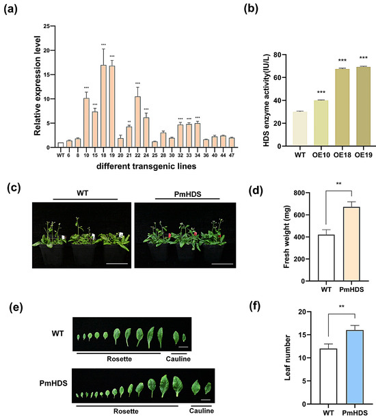 Expression and phenotypic characterization of transgenic A. thaliana. (a) Relative PmHDS expression levels in various overexpression lines. (b) Activity of 1-hydroxy-2-methyl-2-(E)-butenyl-4-phosphate reductase (HDS). (c) Phenotypic comparison between transgenic plants and wild-type plants, scale bar = 7.0 cm. (d) Comparison of fresh weight between transgenic and wild-type plants. (e) The quantities of rosette and cauline leaves between transgenic and wild-type plants, scale bar = 1.2 cm. (f) Statistical analysis of leaf numbers in transgenic versus wild-type plants. (Different quantities of asterisks indicate significant differences: ** p < 0.01, *** p < 0.001.)