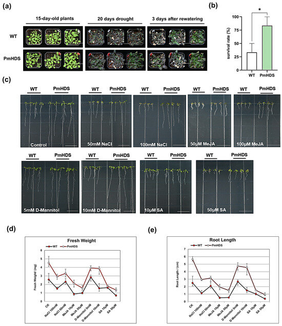 To elucidate the function of the PmHDS, we selected three transgenic OE lines (OE10, OE18, and OE19) for stress treatment. Initially, both transgenic and wild-type A. thaliana plants were subjected to a 20-day drought treatment. Following drought stress, plants were rehydrated for three days, and their growth and survival rates were assessed. Our results indicated that transgenic A. thaliana plants exhibited superior growth compared to wild-type plants after 20 days of water deprivation (Figure 6a). After three days of rehydration, transgenic plants had a survival rate of 83.3%, whereas wild-type plants exhibited a survival rate of approximately 33.3% (Figure 6b). To further investigate the function of PmHDS in response to stress, transgenic and wild-type A. thaliana seeds were sown on 1/2 MS solid culture plates with varying concentrations of NaCl (50 mM and 100 mM), MeJA (10 μM and 50 μM), D-mannitol (5 mM and 10 mM), and SA (10 μM and 50 μM). Phenotypic observations were made after two weeks of growth. Transgenic A. thaliana exhibited enhanced resistance to adverse conditions compared to wild-type plants (Figure 6c). Statistical analyses of root length and fresh weight further confirmed that transgenic plants had increased tolerance to stress (Figure 6d,e). The overexpression of the PmHDS gene in transgenic A. thaliana plants led to enhanced tolerance to drought stress and various hormonal and abiotic stress conditions. This was evident from the superior growth and higher survival rates of transgenic plants compared to wild-type plants under drought stress. Additionally, transgenic plants showed increased resistance to NaCl, D-mannitol, SA, and MeJA treatments, as indicated by their better growth performance, root length, and fresh weight.