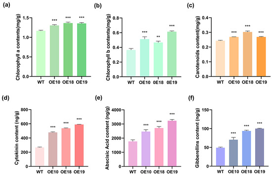 The levels of photosynthetic pigments and the content of related hormones for terpenoid synthesis in transgenic A. thaliana. (a) Contents of chlorophyll a. (b) Contents of chlorophyll b. (c) Contents of carotenoids. (d) Contents of CTK. (e) Contents of ABA. (f) Contents of ETH. (Note: ** p < 0.01, *** p < 0.001.)