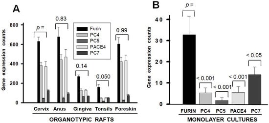 PC gene expression in non-HPV-infected human keratinocytes. Primary keratinocytes isolated from anatomic sites of HPV infection were grown in organotypic rafts (panel A), or in monolayer cultures (panel B). PC gene expression was determined by RT-qPCR and expression count values were standardized to the cDNA concentration and expression of the GAPDH gene. In panel (B), PC gene expression values represent the averages from the five anatomic sites. Data in panel (A) have been previously published but in a different format [5]. Statistical difference significance p-values are shown for the comparisons against the Cervix, in panel (A), and against the FURIN gene, in panel (B), using two-tailed Student t-test. Gene expression values represent means and standard deviations (error bars). Plots were made with SigmaPlot 14.5 software.