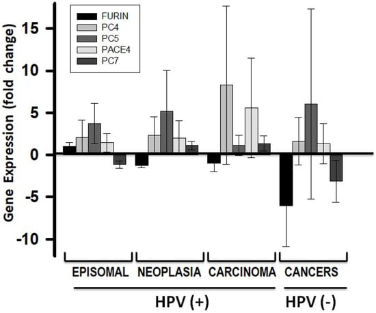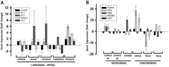 The same primary keratinocytes described above growing in monolayer cultures were electroporated with the HPV16 circular chromosome for the episomal expression of viral genes. The viral genome affected PC gene expression when compared to non-HPV-infected cells (Figure 2A). FURIN expression became downregulated in some anatomic sites. The integration of the viral genome into the host cell’s genome is a further step into the infection process and cancer progression. Several cell lines derived from clinical HPV-positive neoplasia and carcinoma samples harboring multiple integrated copies of the viral genome were tested for their level of PC gene expression (Figure 2B). In the three neoplasia-derived cells, PC gene expression was also affected, and FURIN was downregulated in all of them. In the three carcinoma derived cells, PC gene expression was affected to a larger extent compared to the neoplasia cells, with FURIN being mostly downregulated.