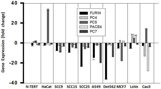 The PC gene expression in several established HPV-negative epithelial cancer cell lines was compared to that in the non-HPV infected control cells shown in Figure 1B. The immortalized N-TERT cell line was practically no different from the control (Figure 3). These cancer cell lines showed PC gene expression profiles largely more affected compared to the HPV-positive carcinomas shown above, and in all of them, FURIN was downregulated. Taken together, the analysis of episomal HPV-infected cells, HPV-positive neoplasia and carcinoma cells, and HPV-negative cancer cells showed not only a progressive loss of the normal pattern of PC gene expression observed in normal cells, but also an increased variability in gene expression, with the FURIN gene being downregulated (Figure 4).
