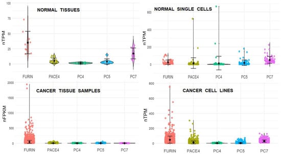 To compare the PC gene expression between datasets of normal and cancer cells, the mean values in Figure 5 were standardized to the GAPDH gene expression and multiplied by ten thousand to avoid fractional numbers (Table S6). However, the large dispersion of the data made it necessary to complement this analysis with an additional analysis based on the modal expression values. The modal distribution data were also standardized to the expression of the GAPDH gene by factoring the center value of the modal range, firstly by the ratio of the modal frequency over the total number of samples in the dataset, and secondly by the middle value of the expression range. The resultant value for each PC gene was then divided by the value that was similarly obtained for the expression of the GAPDH gene. These relative PC gene expression values were then multiplied by one million to avoid fractional numbers (Table S7). Mean and modal derived relative expression values were converted into a percentage of their corresponding total PC gene expression value and averaged (Figure 6). The mean and modal percentage values for the normal tissues closely agreed (Tables S6 and S7). A major result concluded that FURIN expression in cancer samples dramatically increased compared to the normal tissues. FURIN was also the predominant PC expressed in cancer cell lines. The expression of FURIN was lower in normal single cells compared to normal tissues; otherwise, the expression pattern was similar. Together, these results show upregulation of FURIN with respect to the other PC genes in cancer, with the resultant loss of the PC gene expression pattern observed in normal cells.