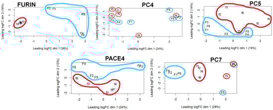Multidimensional scaling comparison of cancer phenotypes based on PC gene expression differences. Each MDS plot shows the comparison between two groups of six cancer cell lines each. One group consisted of cells with the highest expression (F—blue) of a PC and the other group consisted of cells with the lowest (f—red). The identities of all the cell lines are listed in Tables S8–S12. Plots were produced using the Rstudio software.