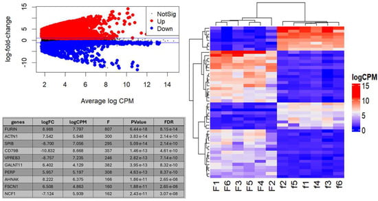Differential gene expression analysis between the high- and low-FURIN-expressing cell lines. Upper left panel shows the MA plot of the average expression of genes (log2 counts per million) versus log2 fold-change in gene expression between conditions F and f. Red and blue dots represent genes that are significantly upregulated or downregulated, respectively. The right-side panel shows the hierarchical clustered heatmap of the 50 most differentially expressed genes between the F and f conditions. The table at the lower left panel shows the identity of the 10 most differentially expressed genes between the F and f cell line groups, the log2 of the fold change in their expression, the log2 average expression level of the gene across all samples, the statistical F value, the p-value, and the false discovery rate value. Plots were produced using Rstudio software and the ComplexHeatmap package.