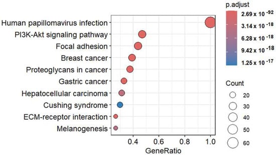 The genes (4584) that showed significant difference in expression between the lowest and highest FURIN-gene-expressing cell groups were analyzed for their ontological functional associations. Groups of genes were found associated with components of cell signaling, surface receptor, growth factor, and extracellular matrix functions (Table 1). Enrichment analysis within these functional association groups further identified categories and subcategories of human diseases related to smaller sets of genes (Table S13). One association was of particular interest, and that was with a set of 64 genes involved in HPV infection (Table S14). Further enrichment to identify the pathways in which this set of 64 genes participates showed an association with several forms of cancer (Figure 9).