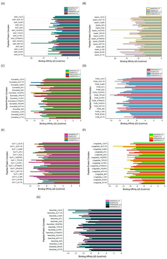 Comparison of molecular docking simulation results from HADDOCK 2.4, HPEPDOCK 2.0, ClusPro 2.0, and HawDock 2.0, showing the binding affinity (ΔG, kcal/mol) of seven therapeutic peptides interacting with CAD-related receptors. (A) ANP peptide-protein complexes. (B) Apelin peptide-protein complexes. (C) Exenatide peptide-protein complexes. (D) FX06 peptide-protein complexes. (E) GLP-1 peptide-protein complexes. (F) Liraglutide peptide-protein complexes. (G) Nesiritide peptide-protein complexes.