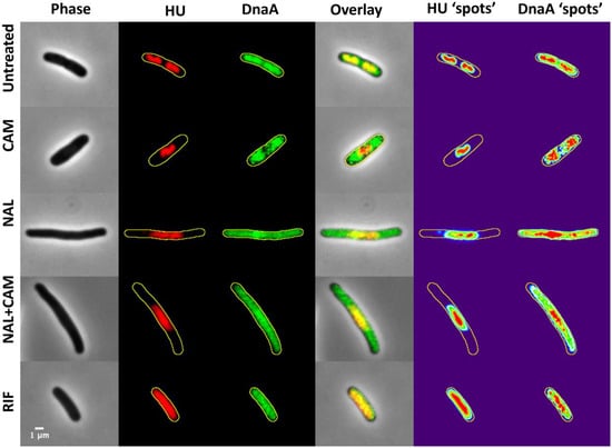 These results suggest the colocalization of DnaA with the nucleoid in untreated cells and partially in NAL-treated, in contrast to a significant separation of the protein from the nucleoid occurring in CAM-treated cells.
