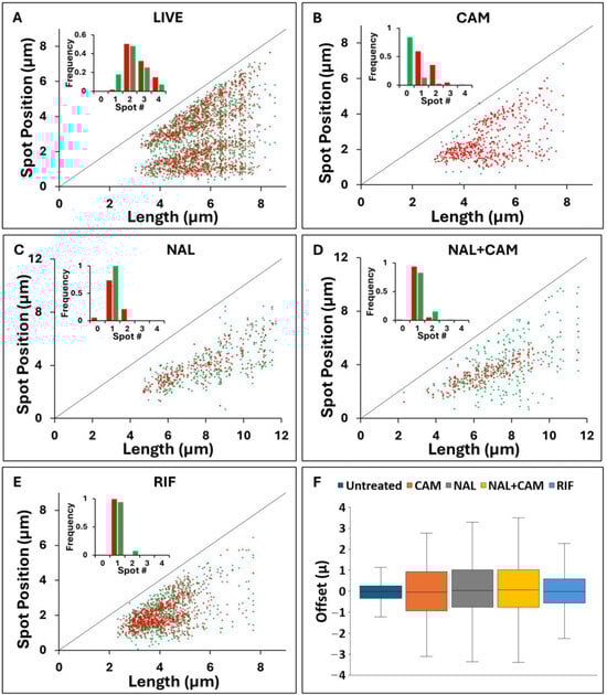 (A–E): Scatter plots of the fluorescence maxima (‘spots’) positions of DnaA-eGFP (green) and HU-mCherry (red) as a function of cell length. Positions are shown as distances from a pole for a population of approximately 500 cells of various lengths; the diagonal line designates the distance to the opposite pole. Untreated (A), CAM-treated (B), NAL- and NAL+CAM-treated (C,D), and RIF-treated populations (E) are portrayed. What may appear as double-nucleoid RIF-treated cells in the scatter plot are due to off-centered single maxima in different cells. The distributions of HU and DnaA spot numbers per cell (Spot#) are shown in the insets. Distributions of distances between paired spots of HU and DnaA in untreated and antibiotic-treated cells are displayed using box plots (F).