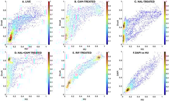 Pixel-intensity-based analysis of DnaA-eGFP and HU-mCherry colocalization in cells in different functional states. Cytofluorograms for eGFP and mCherry fluorescence intensities of single cells; live and treated with CAM, NAL, NAL+CAM, or RIF (panels (A–E), respectively). In addition, Panel (F) shows the correlation between HU-mCherry and DAPI fluorescence intensities. All intensities are normalized to the maximal pixel value in each cell. The color coding reflects the relative densities of experimental points in each panel. Cytofluorograms were generated by the JaCoP plugin for ImageJ and plotted using the MATLAB (version R2024b) subroutine (see Section 4.2.2).