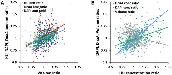 Asymmetry indexes of various components as a function of volume asymmetry (A) and asymmetry of HU concentration (B) in the randomly oriented cell population of 500 live cells. Linear equations were fitted to all data sets as follows. In (A): y = 0.55x + 0.478 (R = 0.4) for HU (red); y = 0.36x + 0.64 (R = 0.26) for DAPI (blue); and y = 0.36x + 0.64 (R = 0.54) for DnaA (green). In (B): y = 0.81x + 0.16 (R = 0.72) for DAPI (blue); y = 0.33x + 0.64 (R = 0.53) for DnaA (green); and y = −0.25x + 1.28 (R = 0.33) for Volume (dark grey).