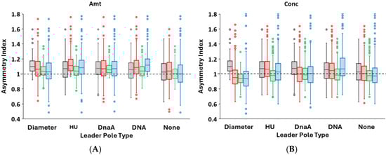 Asymmetry indexes (ratios between two cell halves, see Section 4.3) for cell volume (gray), HU (red), DnaA (green), and DNA (DAPI, blue). The population-wide distributions are shown for different cell alignments using the diameter, HU, DnaA, or DAPI content as leader poles, or unaligned (None). The indexes are calculated for amounts (A) and corresponding concentrations (B). The same volume asymmetry index is shown in (B) as in (A) for comparison. Note that in these box plots the population median is shown; the average values are presented in Table 2.