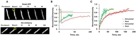 Example of FRAP experiment with live cells. The cells were bleached at the poles (1 × 1 µm yellow squares in (A) and imaged at desired intervals (the time after bleaching in seconds is shown above the selected images). The fluorescence recovery in these areas was quantified ((B), green—DnaA, and red—HU). The horizontal lines in (B) indicate the expected recovery kinetics maxima for DnaA (green) and HU (red). Further analysis by simFRAP ([], Section 4.4) provided the diffusion coefficients ((C), green circles and line—real and simulated DnaA recovery kinetics, and red—the corresponding data and fit for HU).