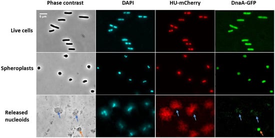 Typical images of cells (upper row), spheroplasts (middle row), and released nucleoids (bottom row) in phase contrast and fluorescence of DAPI-stained DNA (cyan), HU-mCherry (red), and DnaA-eGFP (green, from left to right). All fluorescence images were processed with the “enhance contrast” routine. The space bar (5 µm) is the same for all images in the panel.