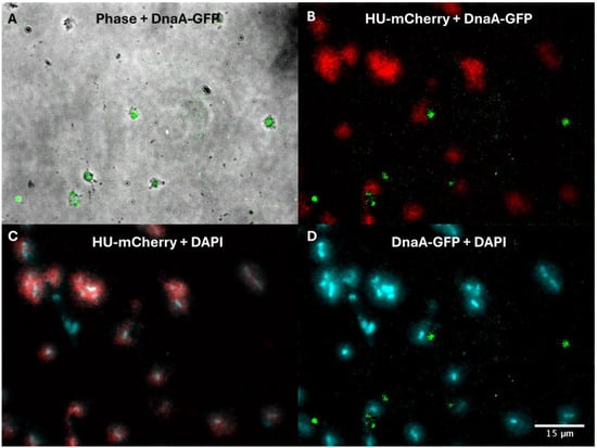 Overlays of phase contrast (gray) and DnaA-eGFP (green) (A), HU-mCherry (red) and DnaA-eGFP (B), DAPI-stained DNA (cyan) and HU-mCherry (C), and DnaA-eGFP and DAPI (D) images of released nucleoids. DnaA-eGFP is visible mainly within collapsed spheroplasts (A) and is hardly detected in the isolated nucleoids (B,D). All fluorescence images were processed with the “enhance contrast” routine before overlaying. The space bar (15 µm) is the same for all images in the panel.