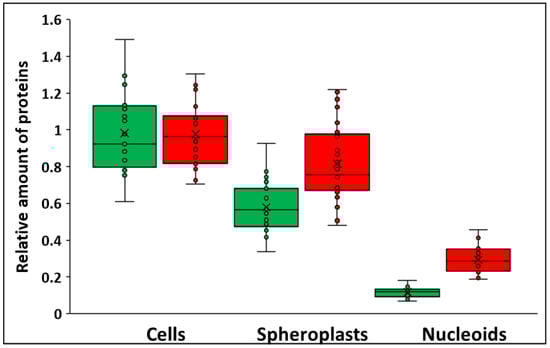 An estimate of the binding affinity of HU and DnaA to the nucleoid. Box plots of the DnaA-eGFP (green) and HU-mCherry (red) integral fluorescence intensities of individual nucleoids relative to the corresponding DAPI fluorescence intensity in cells, spheroplasts, and released nucleoids. The GFP/DAPI and mCherry/DAPI ratios of fluorescence intensities for all samples were normalized to the average intensity ratios of intact cells (cross signs (×) and horizontal lines in the boxes represent mean and median values respectively). Cells MG1655 (dnaA-egfp, hu-mcherry) were grown to steady-state, harvested, and permeabilized with 10% methanol for DAPI staining (see Section 4.1.2). Spheroplasts were prepared as described in the Section 4.1.3 and stained with DAPI without permeabilization. The nucleoids were released from the spheroplasts heated at 37 °C for 10 min and loaded on the agarose pads.
