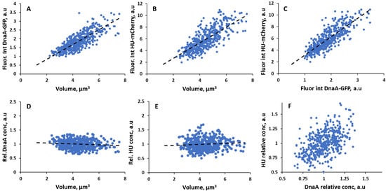 DnaA and HU amounts and concentrations (blue dots) in cells of different sizes in a population. Approximately 500 cells from a steady-state culture grown in Neidhardt medium (generation time 32 min) were measured. The image analysis was performed using ImageJ with the ObjectJ plugin and Coli-Inspector protocol ([] and see Section 4.3). The dependences of total cellular fluorescence intensities of DnaA-eGFP (A) and HU-mCherry (B) on the cell volume and their mutual relation (C) are shown. The data were fitted to a linear function (dashed lines, y = 0.42x, R = 0.81 for (A), y = 1.33x, R = 0.77 for (B), and y = 3.14x, R = 0.82 for (C)). The corresponding dependences of DnaA (D) and HU (E) concentrations (normalized to the population average) on the cell volume are shown. (F)—The relationship between DnaA and HU normalized concentrations.