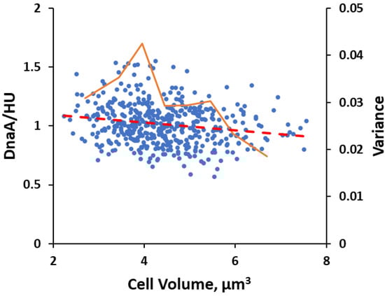 Dependence of the DnaA/HU ratio normalized per population average (blue circles and red dashed linear fit) on the cell volume. Orange segmented line—variance of DnaA/HU in different cell size classes after binning of 0.5 µm3.