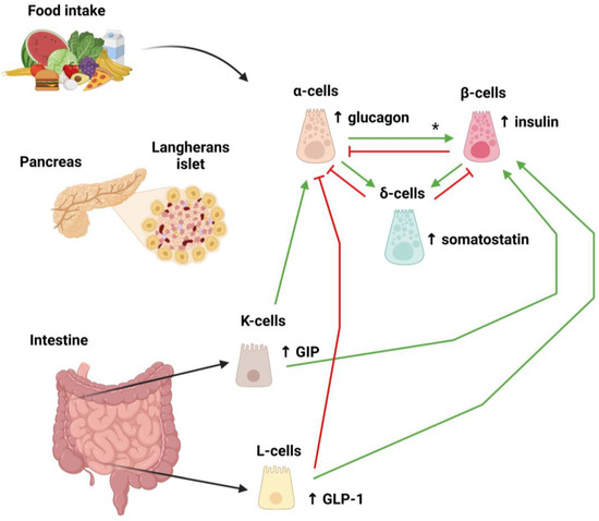 Schematic and simplified representation of the feedback loops triggered by food intake involving the endocrine pancreas and incretin secretion. Following food intake and the related increase in plasma glucose, pancreatic β-cells secrete insulin, while small intestine K- and L-cells secrete gastric inhibitory polypeptide (GIP) and glucagon-like peptide-1 (GLP-1). Both GIP and GLP-1 further stimulate insulin secretion by β-cells. Meanwhile, in order to maintain glucose homeostasis, a complex negative feedback loop involving both glucagon and somatostatin (the latter secreted by δ-cells) is activated. Red lines: inhibitory signal; green arrows: stimulatory signal. * Stimulatory signal from α- to β-cells promoted by proglucagon-like peptides.