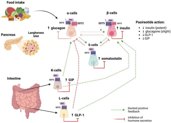 Schematic and simplified representation of the mechanisms underlying pasireotide effects on glucose metabolism. Pasireotide treatment can significantly impact glucose metabolism, acting both on pancreatic islet cells and intestinal K- and L-cells. Throughout its potent binding affinity for SST5, the compound results in a significant decrease in insulin, GLP-1, and GIP levels, which are not fully counterbalanced by a concomitant strong decrease in glucagon levels. * Stimulatory signal from α- to β-cells promoted by proglucagon-like peptides. Abbreviations: SST2: somatostatin receptor subtype 2; SST5: somatostatin receptor subtype 5; PAS: pasireotide.