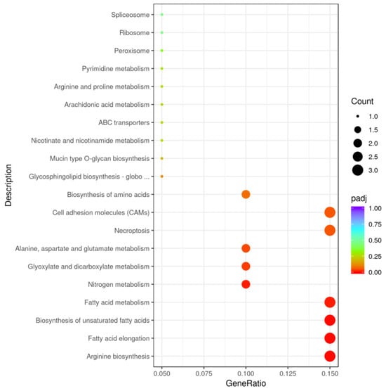 Additionally, the KEGG pathway analysis identified nine significant pathways, including those related to cell adhesion molecules, necroptosis, arginine biosynthesis, fatty acid elongation, and metabolic pathways for unsaturated fatty acids and fatty acids (Figure 4, Table S2). The nine significant pathways included a number of ten genes, whichwere LOC113115398, LOC113054720, LOC113112742, LOC113065066, LOC113110194, LOC11305820, LOC113078755, LOC113038790, LOC113063734, and LOC113114746 (Table S2).