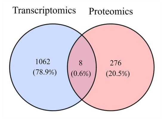 After applying the screening criteria for DEGs and DEPs (as described in Section 4.7), no significant overlap was found between the differentially expressed genes from TMT and RNA-seq data. Additionally, KEGG pathway analysis of the two omics datasets showed no common significantly enriched pathways. Therefore, the DEGs screening criteria were adjusted to p < 0.05 and FC > 2, and common differential genes were re-assessed across both datasets.
