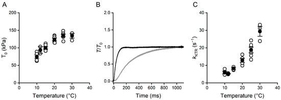 Most of the studies on the effect of temperature on the isometric force included the analysis of the effects on the corresponding kinetic parameters, such as the rate of ATP hydrolysis of actomyosin (kcat), the velocity of unloaded shortening (Vmax), and the rate of force redevelopment following a large release (kTR). The Q10 (the ratio of the value of the parameter under investigation at a temperature over that at a temperature 10 °C lower) was found systematically higher for the kinetic parameters than for the isometric force. In particular, in the rat skinned trabecula, de Tombe and Stienen [] found a Q10 of 1.4 for the force (the same as in this work, Table 1) and twice larger Q10 values for kcat and kTR. Notably, a larger temperature sensitivity of the kinetic parameters can be appreciated in this work as far as kTR (Figure 1C), the temperature dependence of which showed a Q10 of 2.2 (Table 1), comparable to that reported by de Tombe and Stienen [].