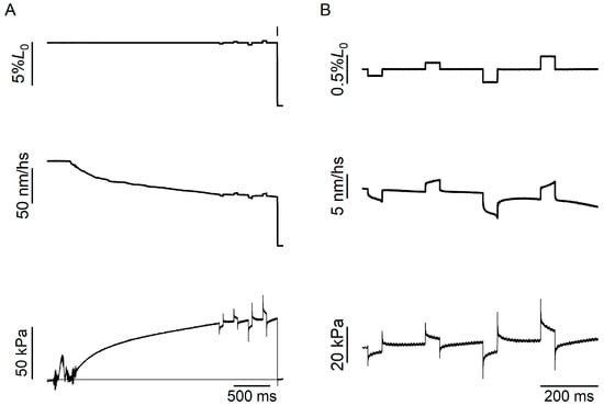 Skinned trabeculae were clamped with aluminium clips for attachment to the levers of a fast loudspeaker motor and a capacitance force transducer with 50 kHz frequency resonance. A trabecula was then mounted in the experimental chamber between the transducer levers in a drop of relaxing solution. To minimise the end compliance of the skinned trabecula, its extremities were glued to the clips with shellac dissolved in ethanol (Sigma, St. Louis, MO, USA) [,]. To recover the distance among myofilaments, increased following skinning, the osmotic agent dextran T-500 (5% w/v) was added to the experimental solutions []. After dextran equilibration, the sarcomere length (SL), width (w), and height (h) of the trabecula were measured at 0.5 mm intervals in the 1.5–2.5 mm central segment of the relaxed trabecula with a 40× dry objective (Zeiss, NA 0.60) and a 25× eyepiece (Objective and eyepiece from Zeiss, Oberkochen, Germany). The trabecula length (L0) was adjusted to set SL at 2.3 µm.