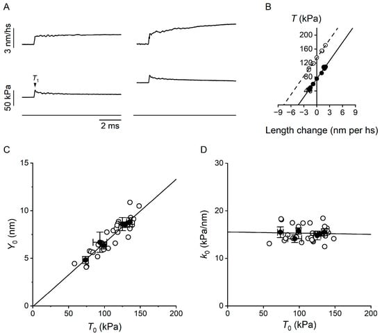 The length step elicited a simultaneous change in force, which measured the elastic properties of the half-sarcomere, followed by a quick partial recovery of force due to the execution of the working stroke by the attached motors synchronised by the length step [,] (Figure 3A, left panel, 10 °C; right panel, 25 °C). The speed of the quick force recovery was larger for step releases than for step stretches, and for step releases it increased with the step amplitude. This would increase the degree of truncation of the force attained at the end of the step, T1 (arrowhead in Figure 3A), going from the largest stretch to the largest release. However, for small length changes completed within 100 μs, like those used here, the truncation was negligible, as was made evident by the inspection of the relation between T1 and the change in the half-sarcomere length (Figure 3B), which appeared linear, as expected from a purely elastic response. The slope of the T1 relation measures k0, while the intercept on the length axis measures the strain in the half-sarcomere (Y0) at the isometric force attained just before the length step. It is evident from Figure 3B that k0 was the same at 25 °C (dashed line, linear fit to the open symbols) as at 10 °C (continuous line, linear fit to the filled symbols). k0 from six experiments was 15.1 ± 0.4 kPa∙nm−1 at 30 °C and 15.5 ± 1.1 kPa∙nm−1 at 10 °C (Table 1). Instead, Y0 was smaller at 10 °C (4.8 ± 0.4 nm) than at 30 °C (8.5 ± 0.3 nm). The reduction was by 43%, the same as the reduction in isometric force. Consequently, while the relation of k0 versus the force developed at each temperature (Figure 3C) showed that the stiffness did not change with the temperature-dependent change in isometric force, the relation of Y0 versus the force developed at each temperature (Figure 3D) showed that the strain of the half-sarcomere decreased in proportion to the decrease in isometric force with lowering temperature.